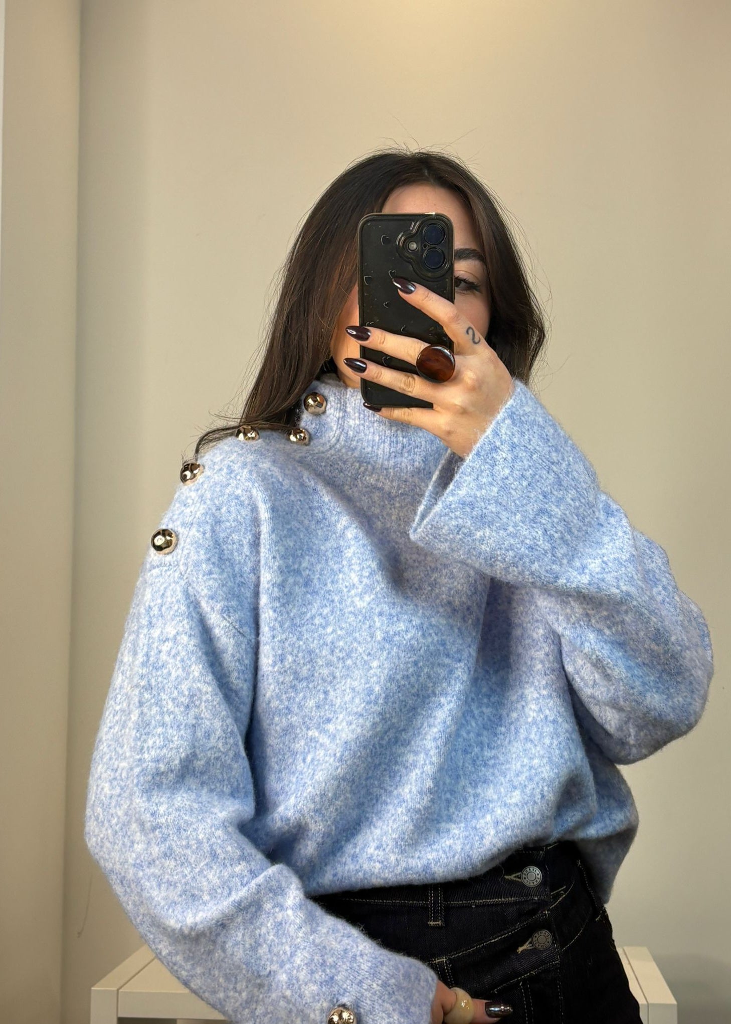 Pull court taille unique avec col et manches à boutons dorés.