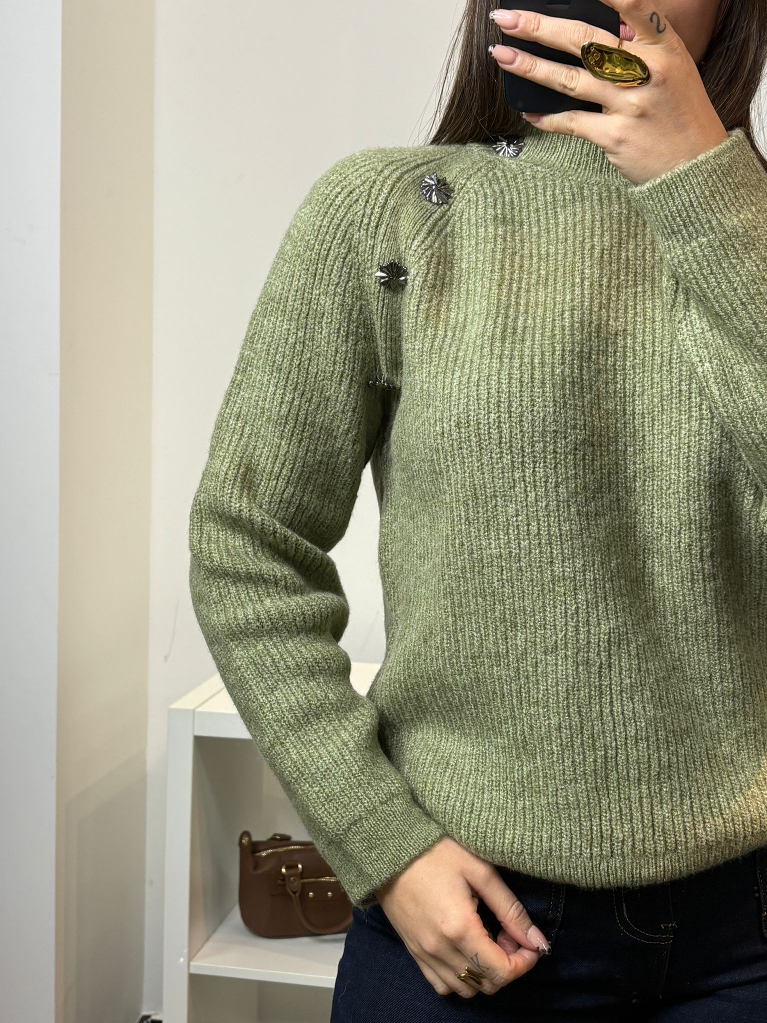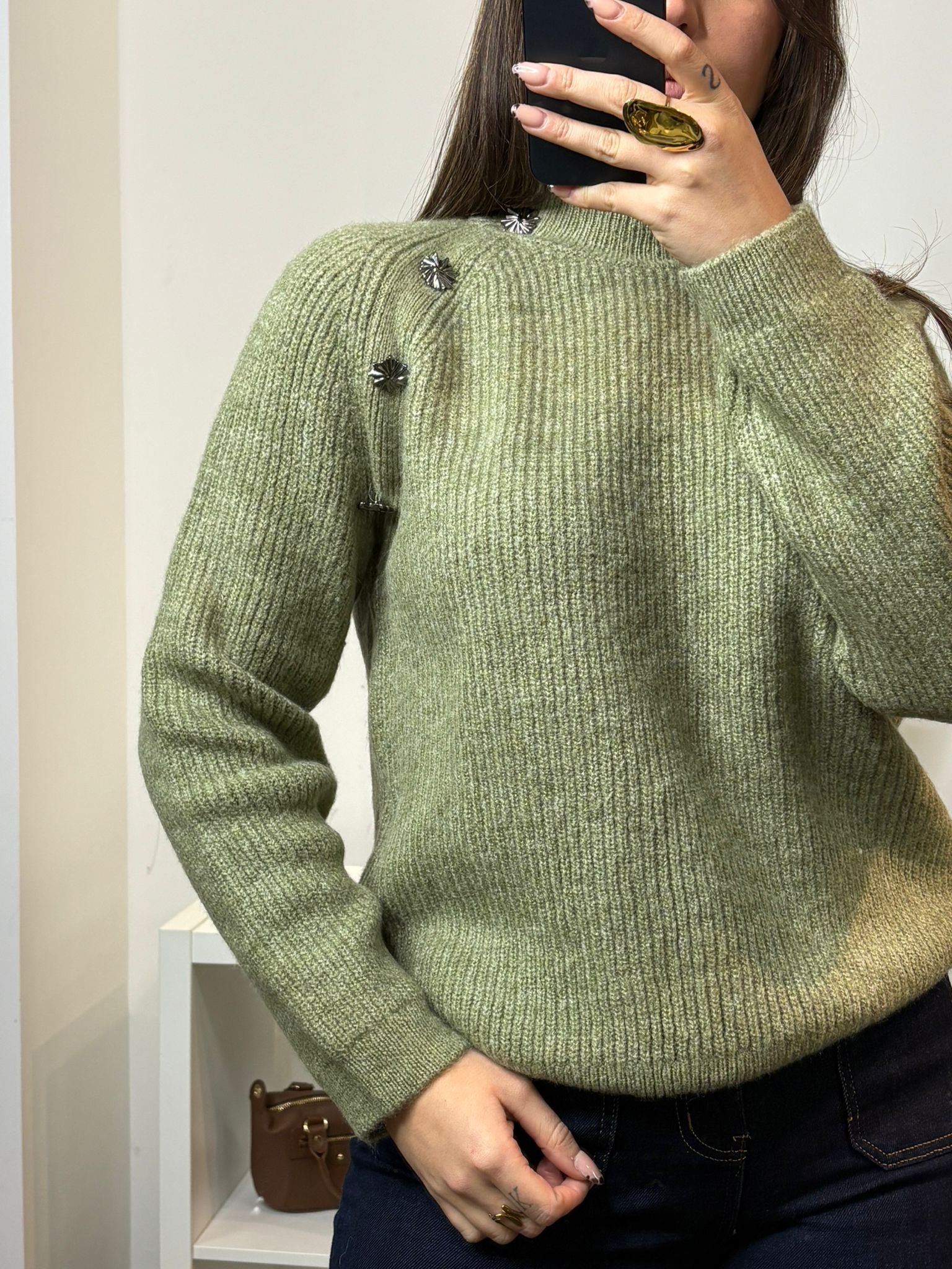 Pull taille unique avec boutons décoratifs sur le côté gauche.