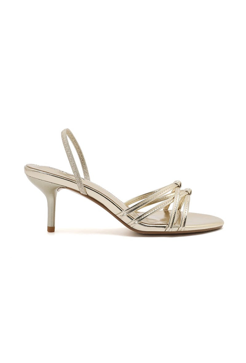 Sandale à talon kitten de couleur dorée.